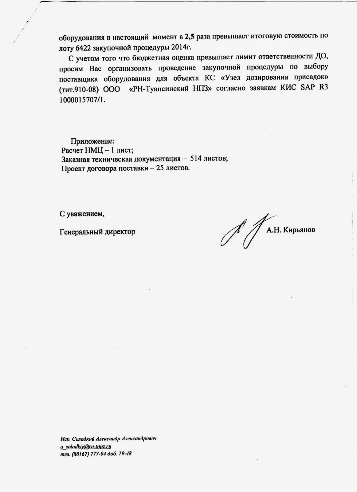 Один из последних примеров. В апреле 2014 года тот же Туапсинский НПЗ направил в головной офис свою оценку на поставку электротехнического оборудования на сумму 1,2 млрд рублей. Цена соответствовала среднерыночной, компания-поставщик обладала репутацией надежного партнера. На Туапсинском НПЗ уже готовились в ноябре 2014 года монтировать новое оборудование.